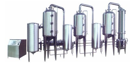 本浓缩器适应于中药、西药、葡萄糖、淀粉、味精、食乳品、化工等液料的浓缩,尤其适用于热敏性物料的低温真空浓缩。我公司经过精心计算,周密设计改进后,比原来的特点效益更多。贵厂可根据浓缩量大小,来选用技术参数中系列浓缩器。特点与效益:1、节能效益,按SJN-1000型计算,一年节约蒸气约5400吨,冷却水14万吨,节约电13万度,降低成本近20万元。2、本浓缩器采用外加热自然型循环式与真空负压蒸发方式,具有蒸发速度快,浓缩比重大,可达1.4(一般中药浸膏),不需敞口锅收膏。3、本浓缩器采用三效同时蒸发,二次蒸汽得到反复使用,与单效比能耗约降70%,不到一年可用节能费中收回本浓缩器的全部投资。4、多功能操作特点:a可以回收酒精浓度在80度左右;b三效可以浓缩三种不同的物料;c一效、二效、三效、三效、二效、一效可以反复并锅收膏;d可以间歇、连续进料浓缩;e可以一次成膏,由第一效进料,经过第二效,第三效出来已一次成膏。5、本浓缩器有特殊构造,浓缩出来的物料具有味道浓,膏质均匀。使物料在密封中无泡沫状态下进行浓缩,不易跑料,减少污染,当天物料当天浓缩完毕,不易结焦,清洗方便,打开加热器上下盖即可清洗,并节约劳力,一人可以操作。6、本浓缩器与物料接触部位均采用不锈钢SUS304制造,加热器、蒸发器外均设有保温层,保温采用聚氨酯发泡,外表面磨砂亚光处理,符合GMP医药标准。