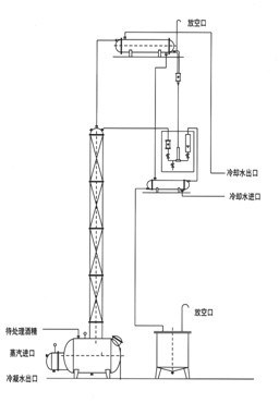 酒精回收塔由塔釜、塔身、冷凝器、冷却器、缓冲罐、高位贮罐六部分组成,适用于制药、食品、轻工、化工等行业的稀酒精回收,具有节能、环保、降低生产成本、提高效率的优点。本装置可将30-50度的稀酒精蒸馏到93-95度残液排放含醇度底符合环保要求。本装置采用高效不锈钢波纹填料,接触物料部分全部采用SOS304不锈钢符合GMP标准。